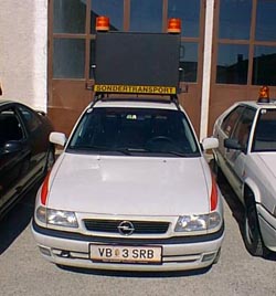 Mit unserem Opel Astra mit Faseroptik-Tafel, von Kennern sofort als beeidetes Straßenaufsichtsorgan erkannt, begleiten wir Ihre Sondertransporte - egal ob besonders schwer oder übergroß! |